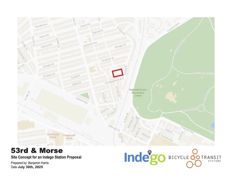 Wynnefield expansion plans & updates: New Indego Bike Station coming to Wynnefield on February 25, 2026 @The Hawthorn apartments, 53rd Morse Street, 19131. See site plans below. New Indego Bike Station at the Overbrook Station on November 20, 2025. See site concept plans below. Indego representatives have been working in partnership with the Wynnefield Community, touring the neighborhood and sharing ideas for potential Indego sites. Contact WCNA and leave a message, if you have any questions @ 215-598-2410.