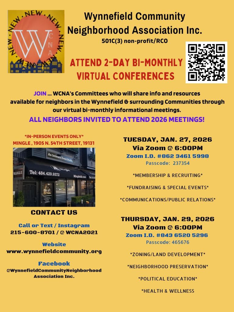 Neighbors, you are invited to join WCNA at special events, meetings & fundraisers that support and strengthen our Wynnefield neighborhood. Visit our Monthly Calendar below for links to participate in our virtual meetings or attend special events in person.