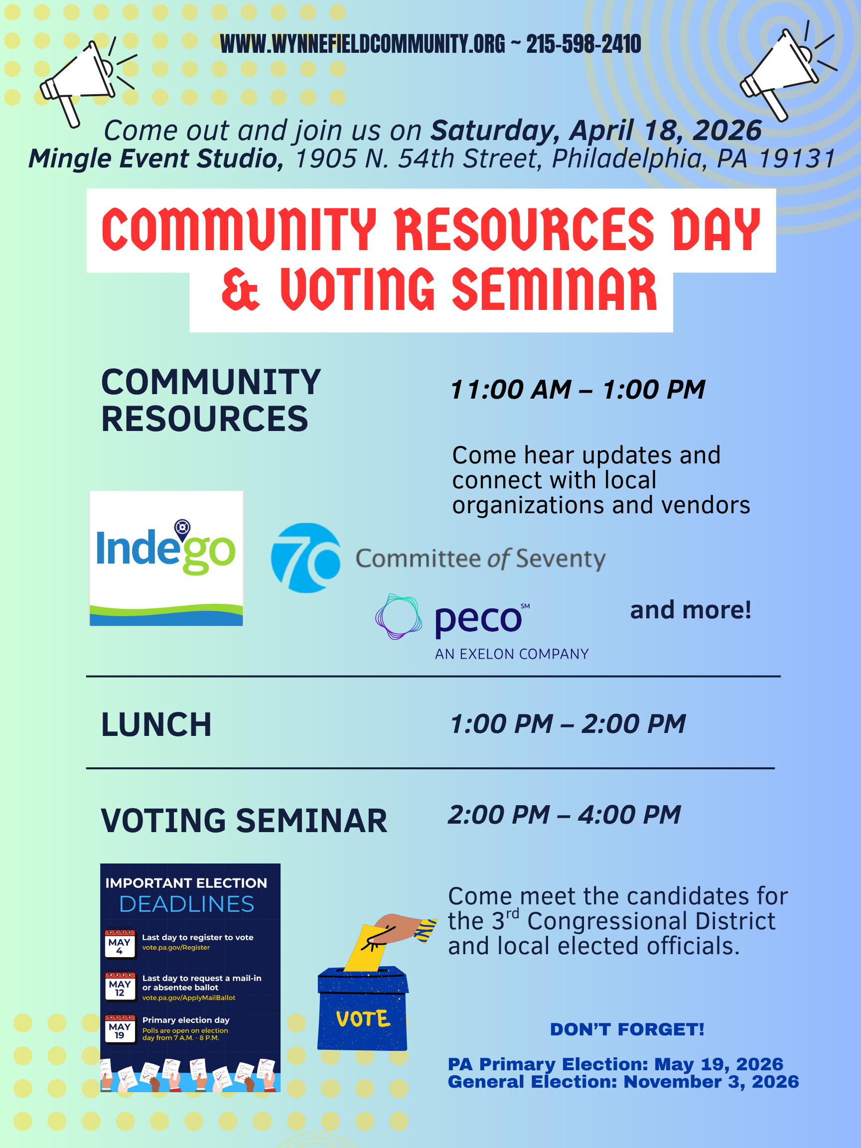 Get involved with WCNA’s Political Education Committee. Do you want to understand how neighborhoods are impacted by political laws? Learn whose on the ballot for the 2026 Primary Election? Voting is how we protect Pennsylvania democracy. Get ready to do your part in 2026 at http://vote.pa/register. Join WCNA for a Community Resources Day of Education on Saturday, April 18, 2026, begins at 11:00AM, followed by lunch 1-2pm and our Voting Seminar begins at 2:00PM. Our special guest will be the Committee of Seventy and invited to attend are many of the Primary Election 2026 candidates.